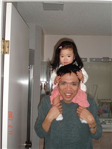 Felicia終於懂得坐在肩上時, 要緊緊的抓住把拔的頭髮了.