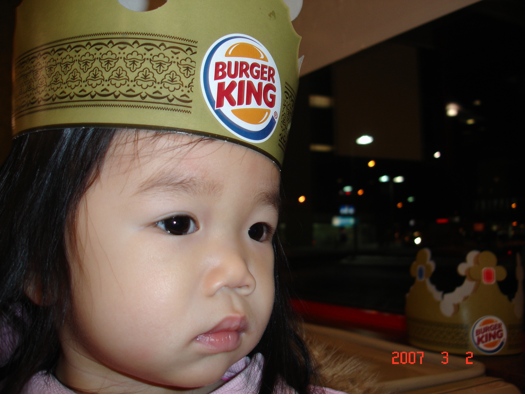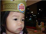 到Burger King吃漢堡時, Felicia看到前座的三位小哥哥都戴著王帽, 也跟著拿了一頂來戴.