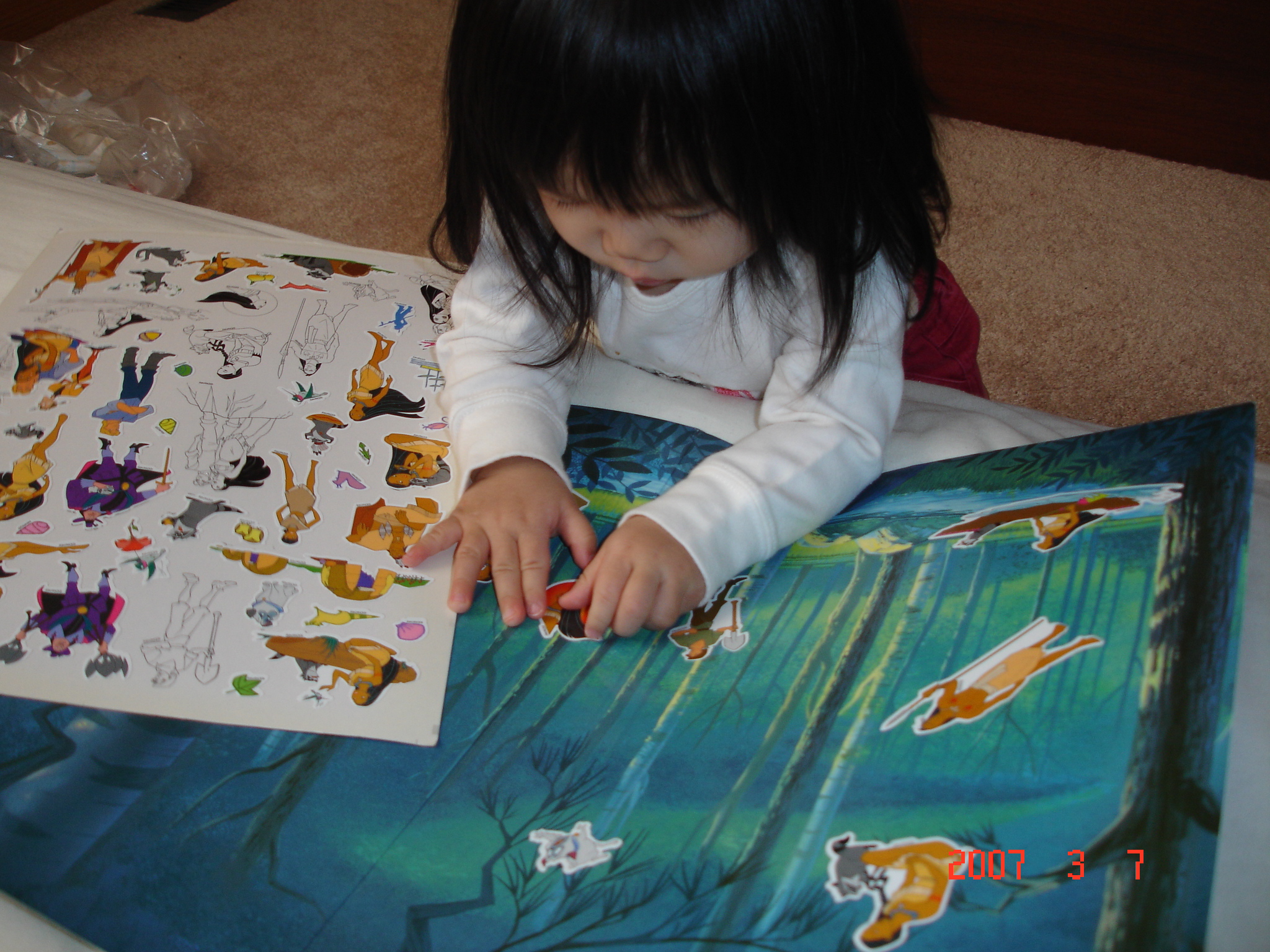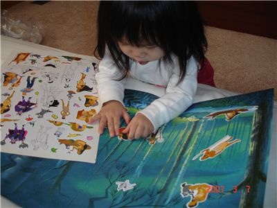 阿姨送的這個靜電貼紙簿, 對Felicia來說還有點難, 因為貼紙的菱菱角角較多, 太細的部份, Felicia還無法自行拿起來. 不過靜電的功能, 比在卡加利買的好多了, 真的可以重覆一直黏貼.