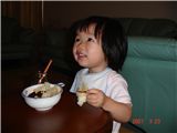 坐在小板凳上吃飯, 不過小板凳會跑, Felicia就得邊吃邊移桌子(大椅子).
