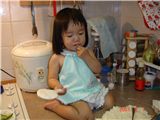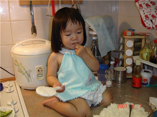 Felicia幫忙調壽司飯, 媽咪問說好不好吃, Felicia回答 "好吃!"