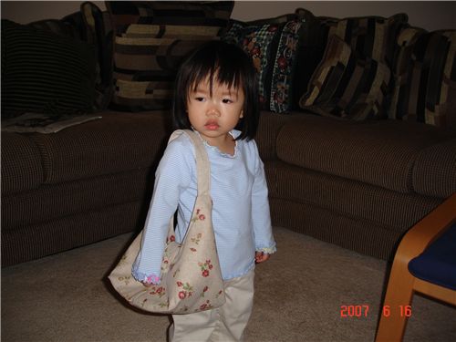 Felicia看到媽咪新做好的包包, 只說:"媽咪, 拿", 就把它給背走了.