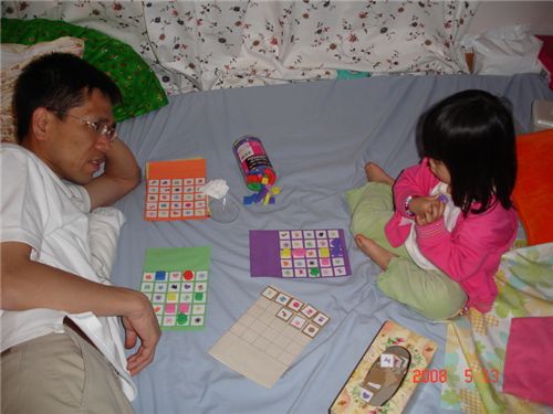 睡前Felicia找把拔玩形狀的Bingo, 把拔說只玩一次, 結果, 後來被Felicia拗到玩三次.