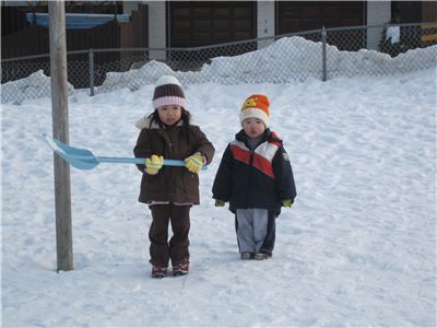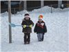 滑完雪, 二個小朋友還不願意回家, 在路上看到剷著, 又要剷雪了