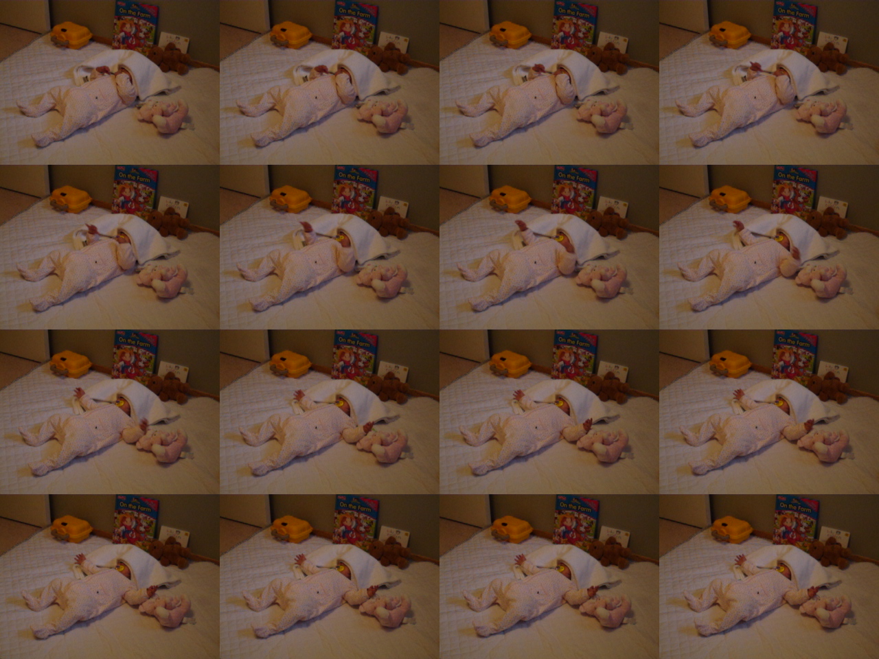媽咪把Felicia放在地上讓她自己玩, 結果, Felicia自己玩躲貓貓遊戲, 本來蓋在肚上的被子, 已經何時被玩到臉上去了.