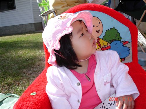 在我們社區Garage Sale的第一站, Felicia已經坐在椅子上了, $50cents把拔說買了!