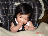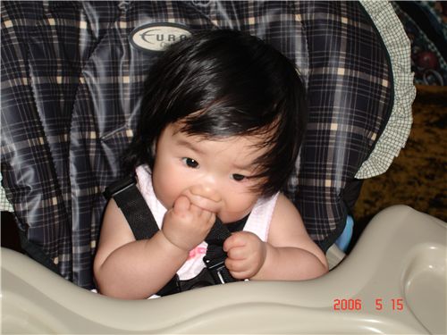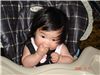 當媽咪在準備副食品時, Felicia坐在餐椅上等時, 啃安全帶就是她的點心了.