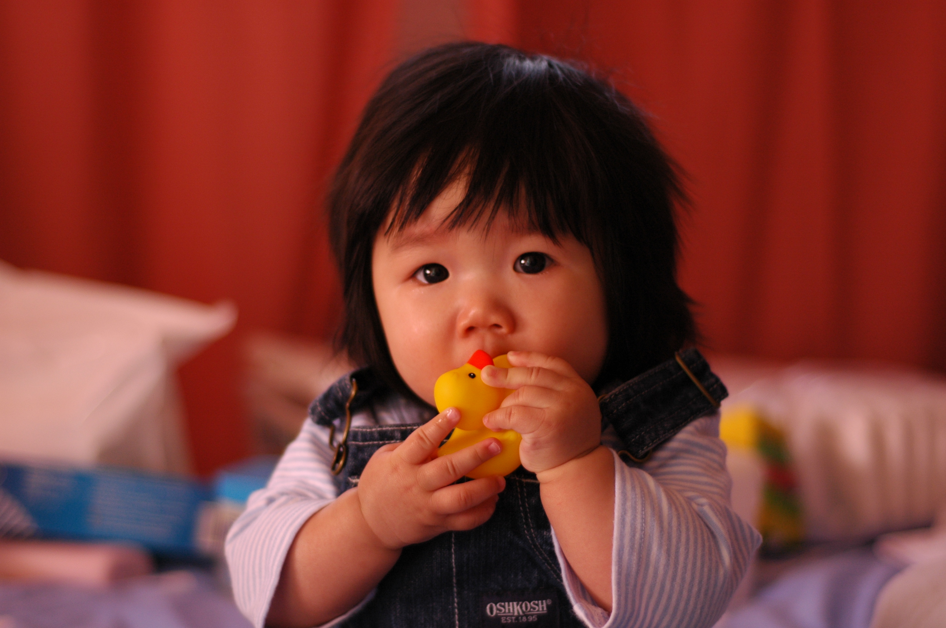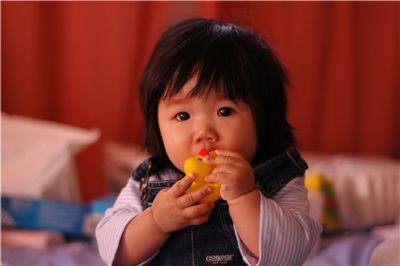 Felicia本來會怕黃色小鴨子, 現在卻喜歡拿它來磨牙
