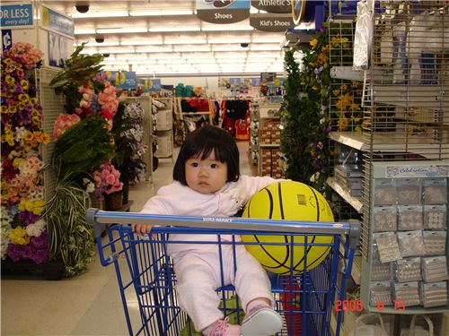 Felicia坐在球旁邊, 看起來球好像變大顆了