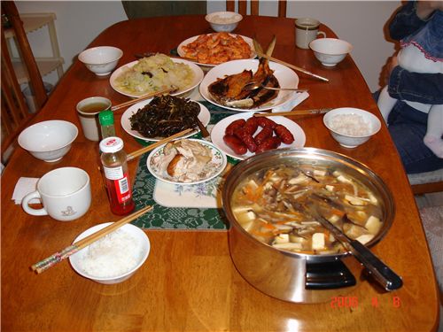 Yun準備豐盛的晚餐: 烤虱目魚, 烤台式香腸, 炒海茸, 炒蝦, 蝦米炒白菜, 酸辣湯.
