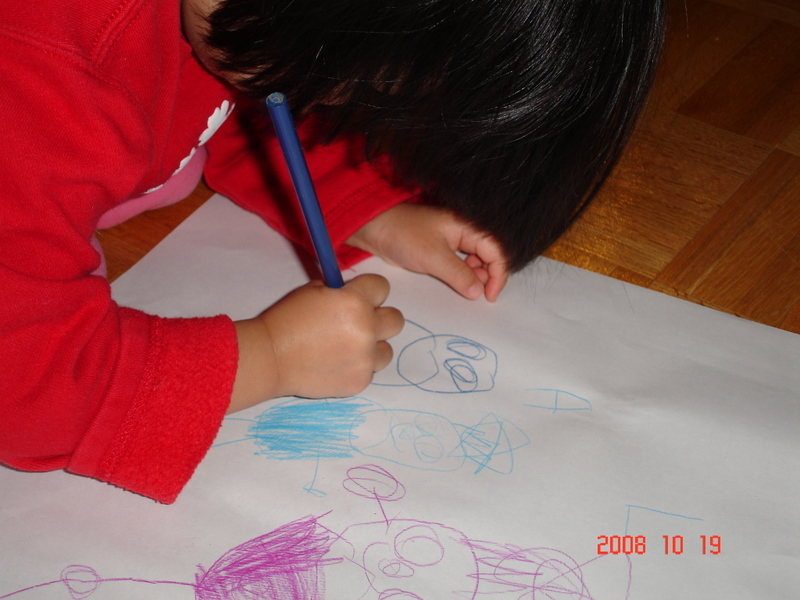 媽咪一看好興奮問暇暇說: 「好漂亮哦, 可以畫一張媽媽嗎?」 暇回答:「可以呀」 媽咪馬上拿了一張已著完色的畫紙背面讓Felicia畫. 很快的她就畫好媽咪, 畫圖的步驟和上述一樣.