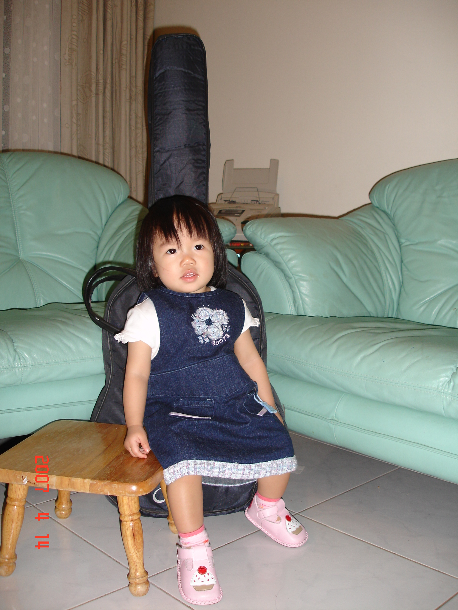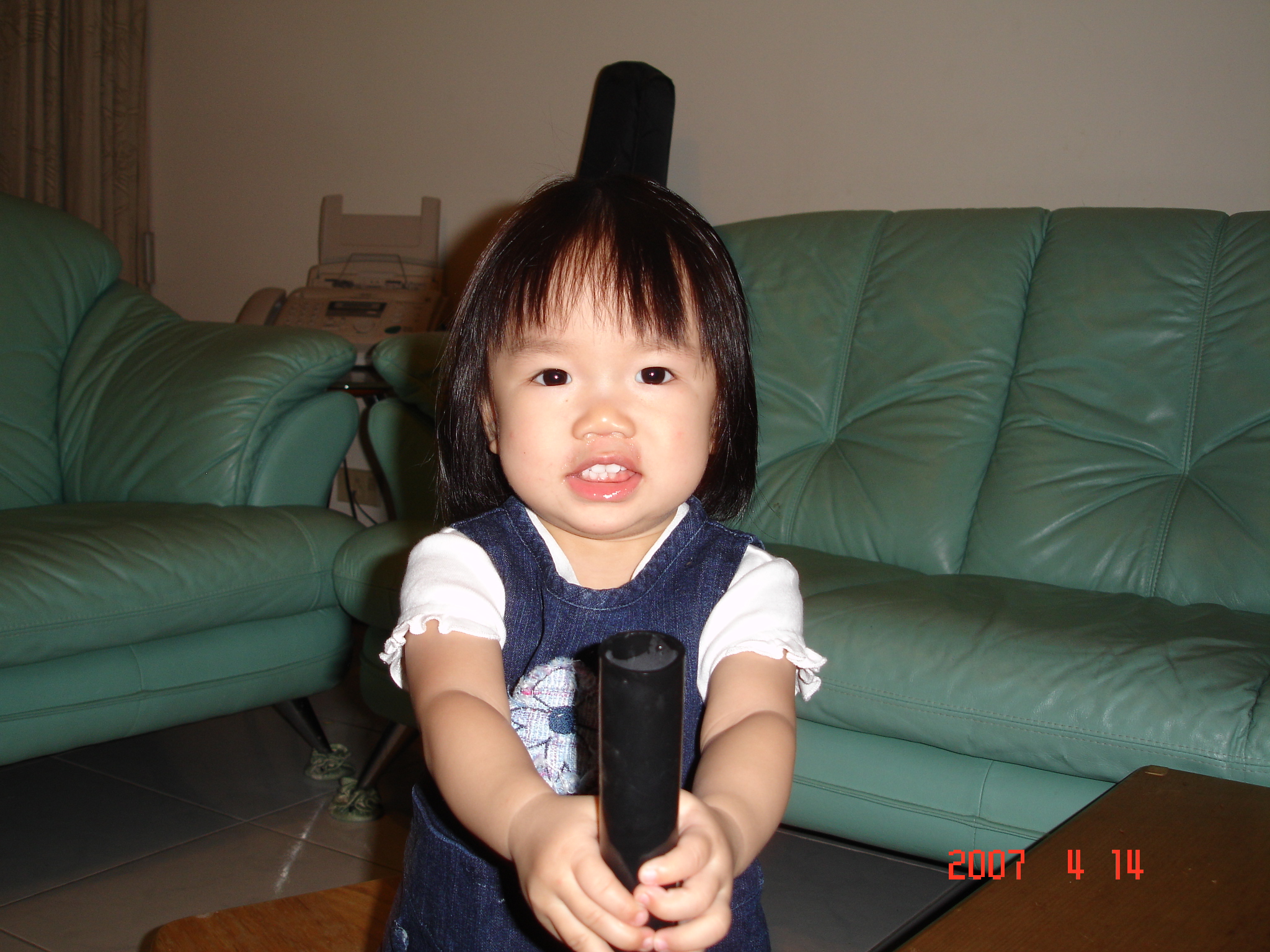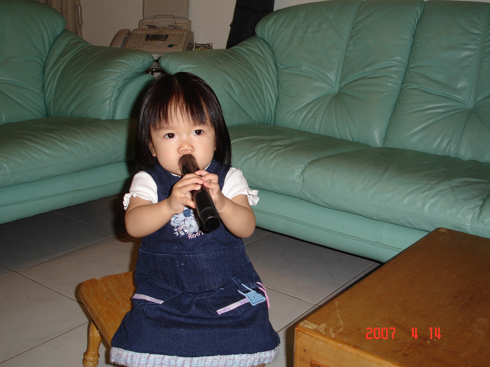 外婆把鞋櫃中間的桿子洗乾淨讓Felicia玩, Felicia把它當笛子, 還自己邊吹邊出聲呢. 就像真的樂器一樣.