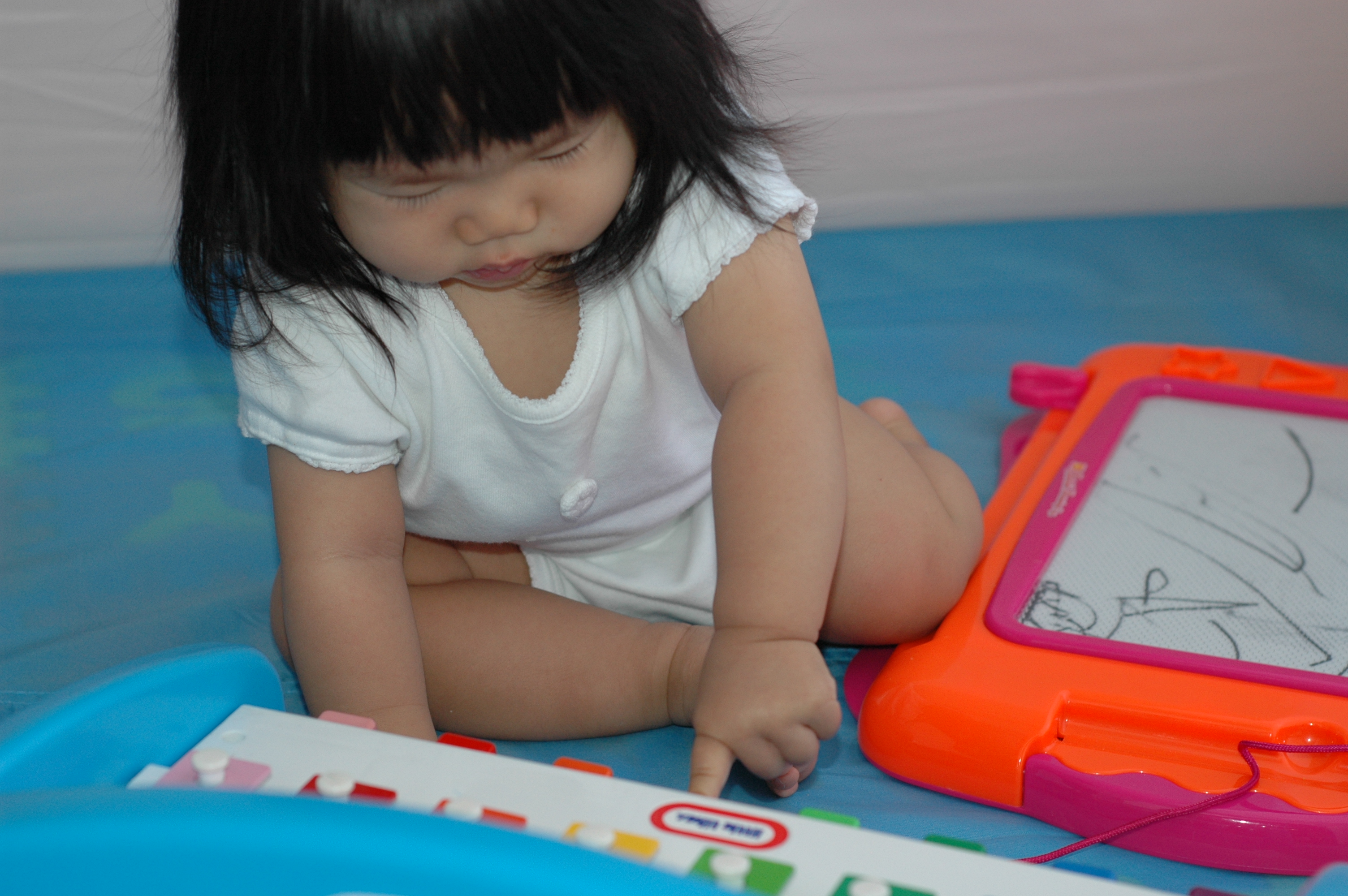 Felicia在帳篷裡玩畫板, 現在會自己拿著筆筆畫畫了