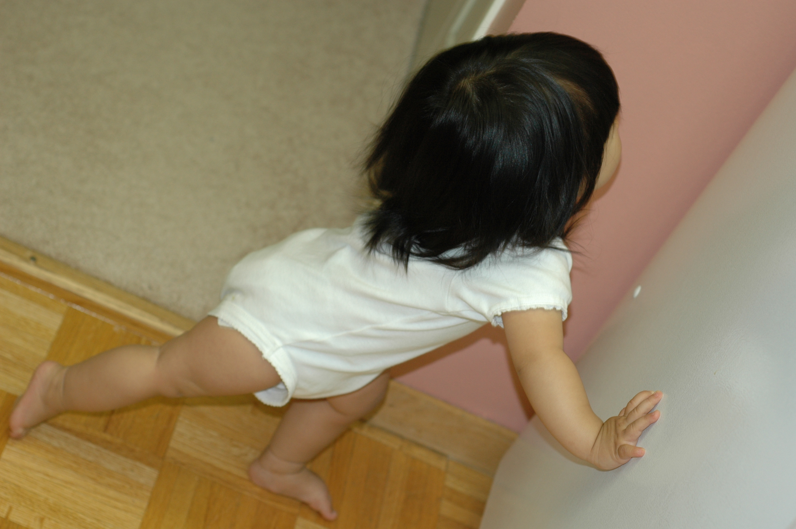 Felicia現在會和床下的大絨毛狗狗玩了, 先摸摸眼睛再摸摸鼻子...