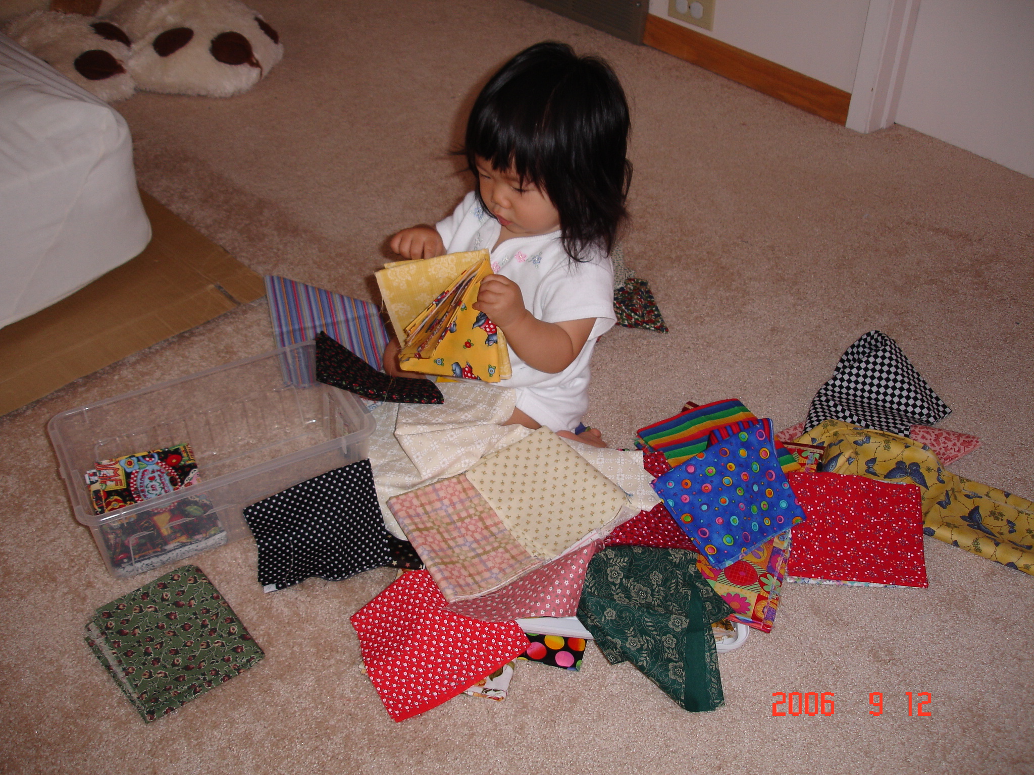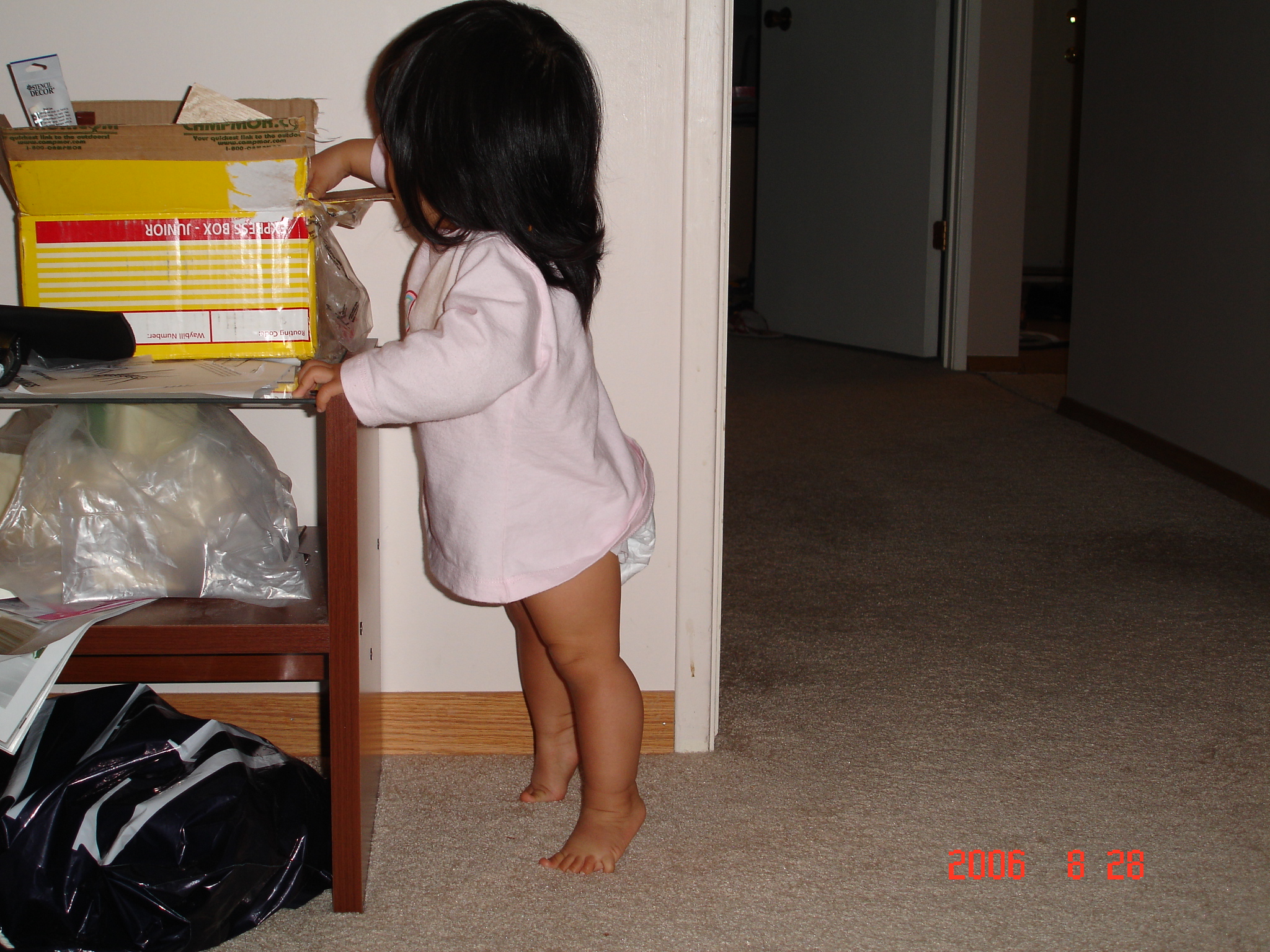 Felicia不夠高, 又對盒子裡的東西充滿好奇, 於是踮著腳尖一直在箱子裡挖寶