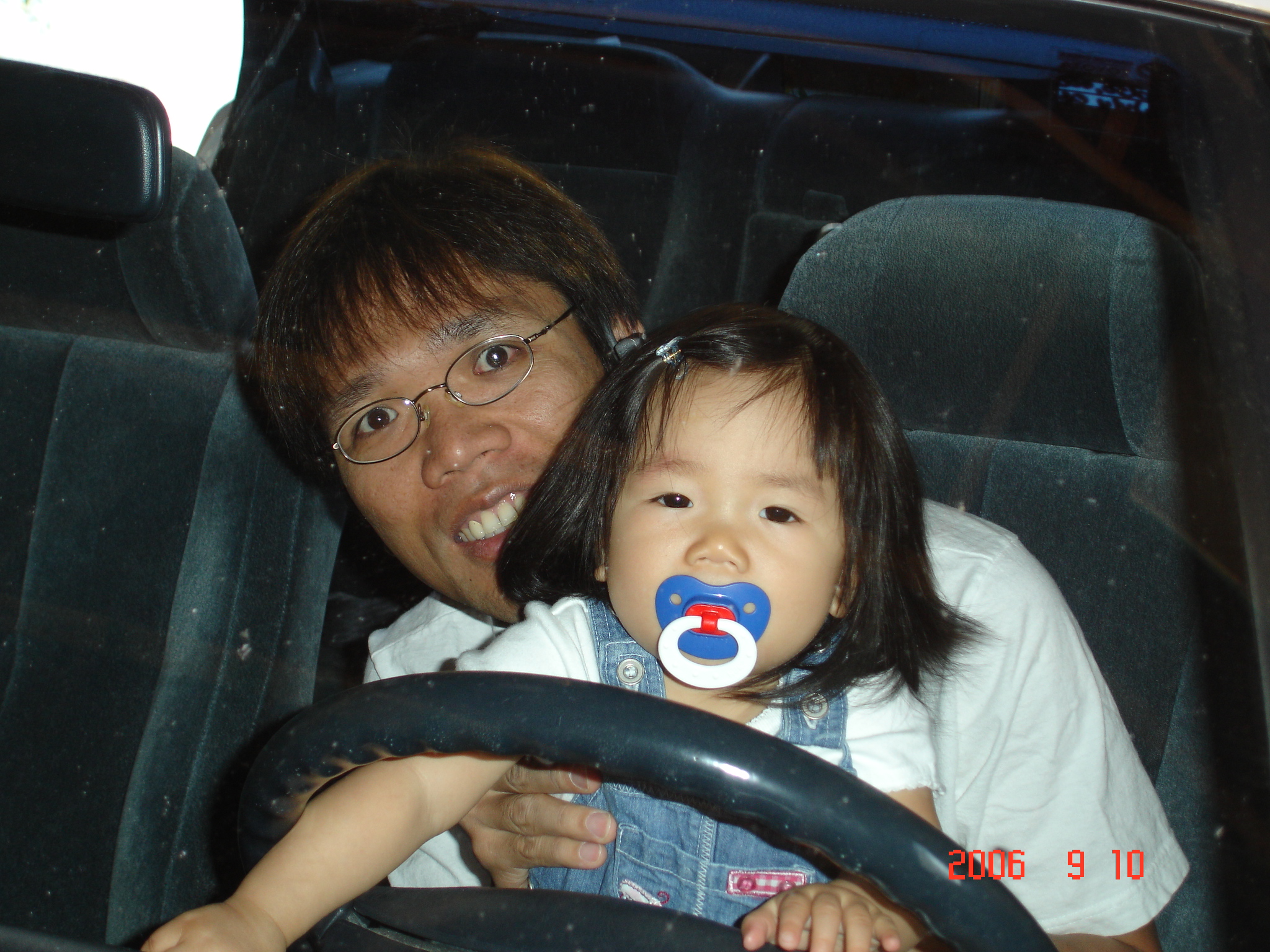 在車上等媽咪收東西的Felicia, 居然開起車來了, 很好玩喔~
