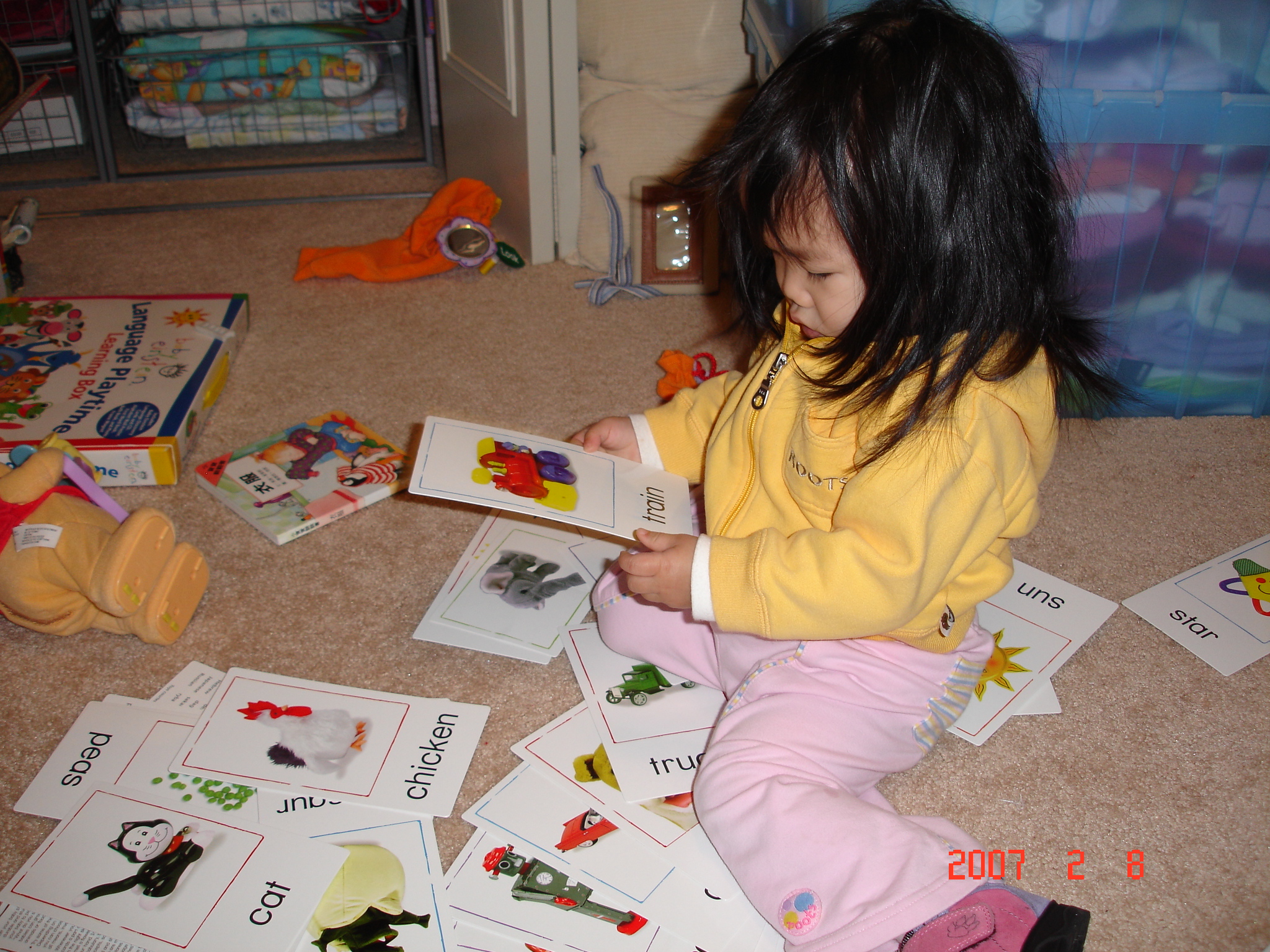 Felicia很喜歡玩英文單字卡, 她已經知道卡片的正面與反面了, 收的時候她會把它全部衣同一個方向收起來.