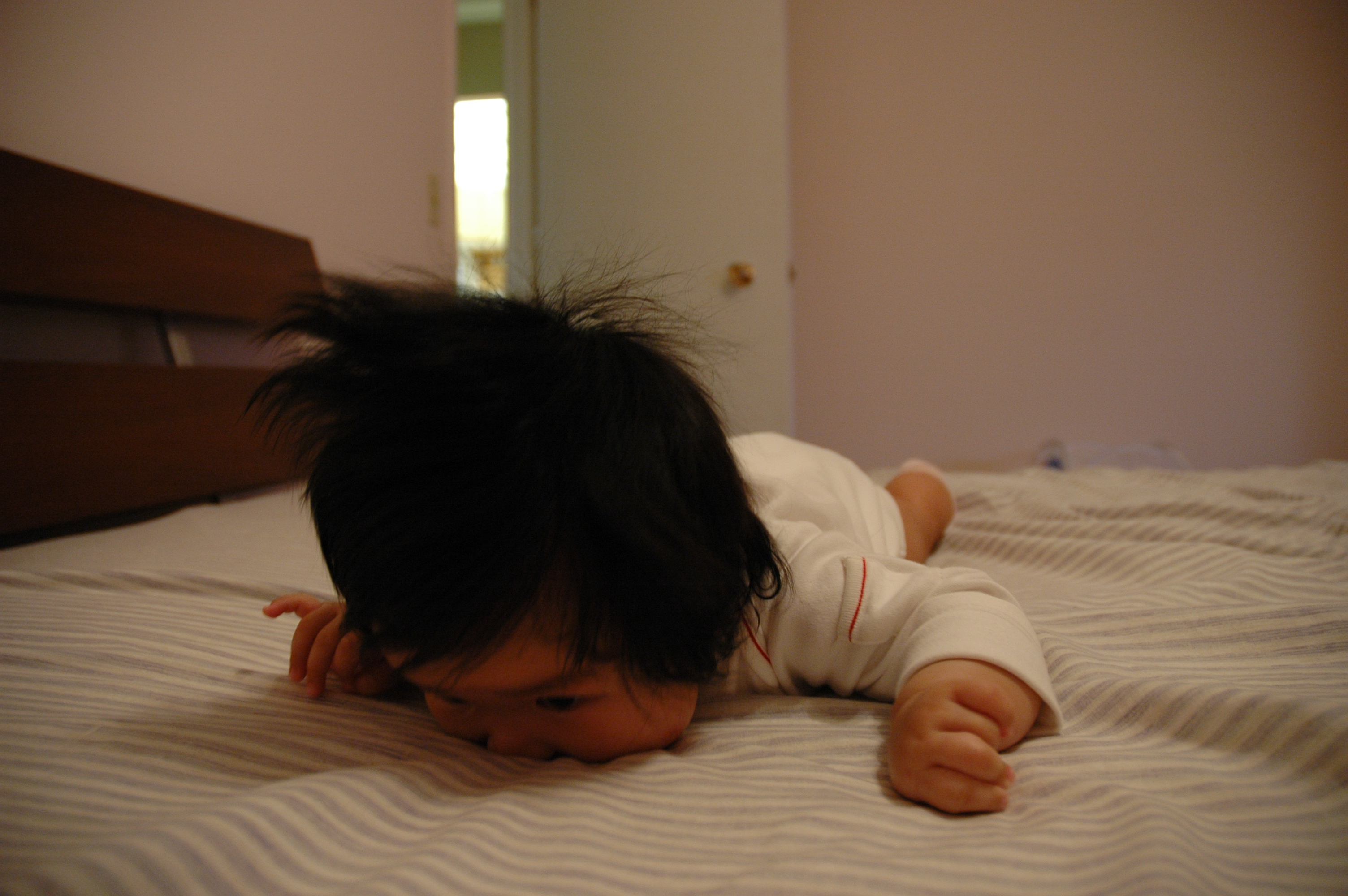 Tummy Time剛開始時, 雙手是彎在裡面的, 頭抬高東張西望.