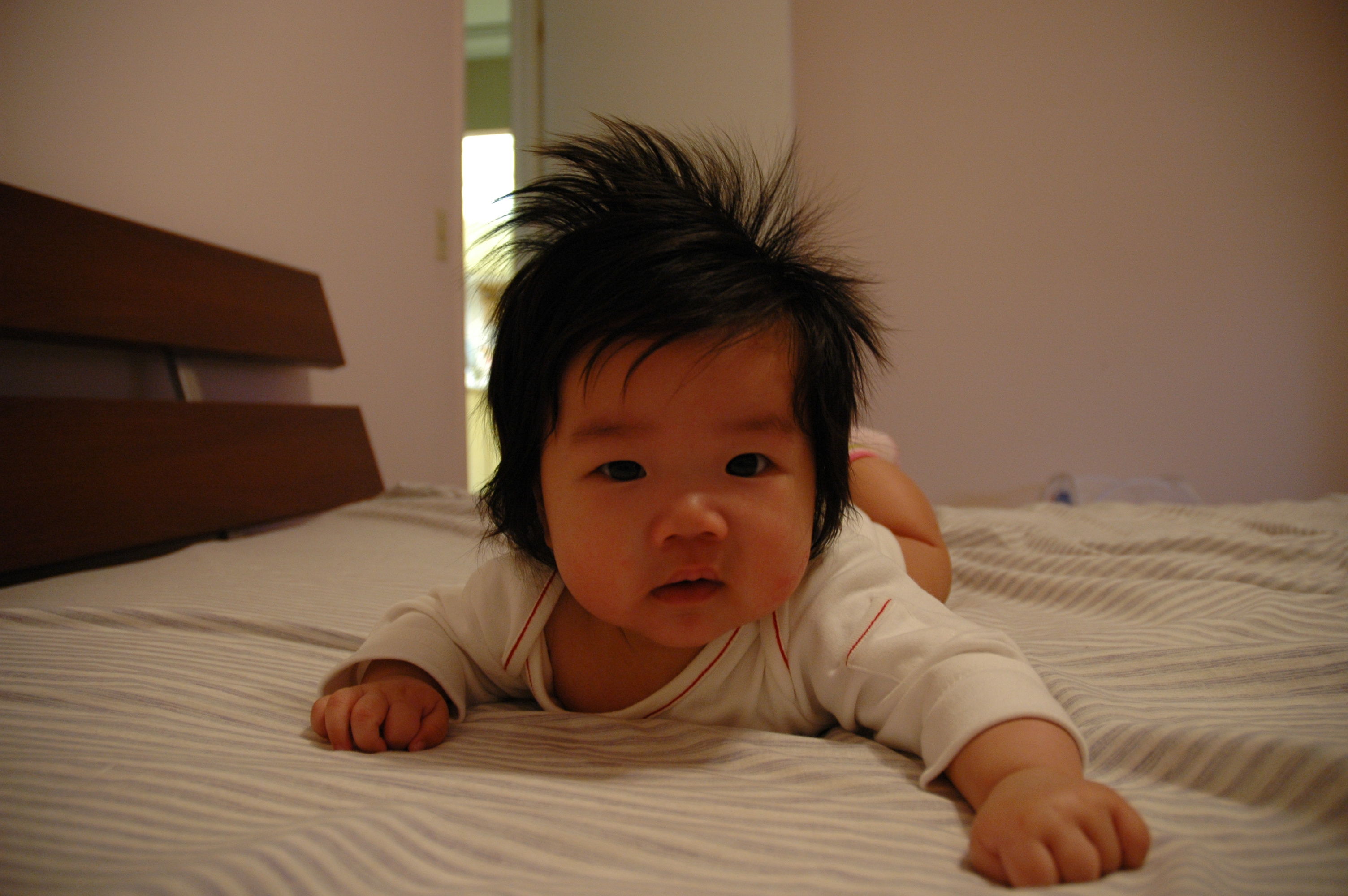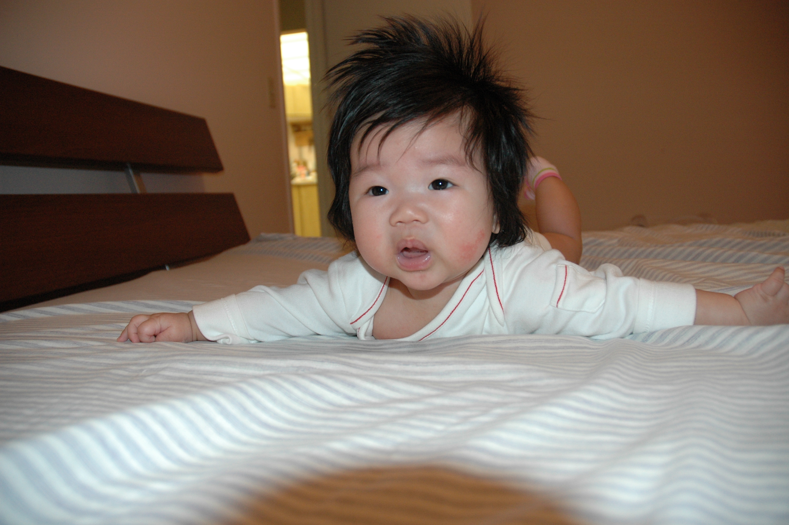 Felicia可以躺成直線, 已經是好幾次Tummy Time練習的成果了.