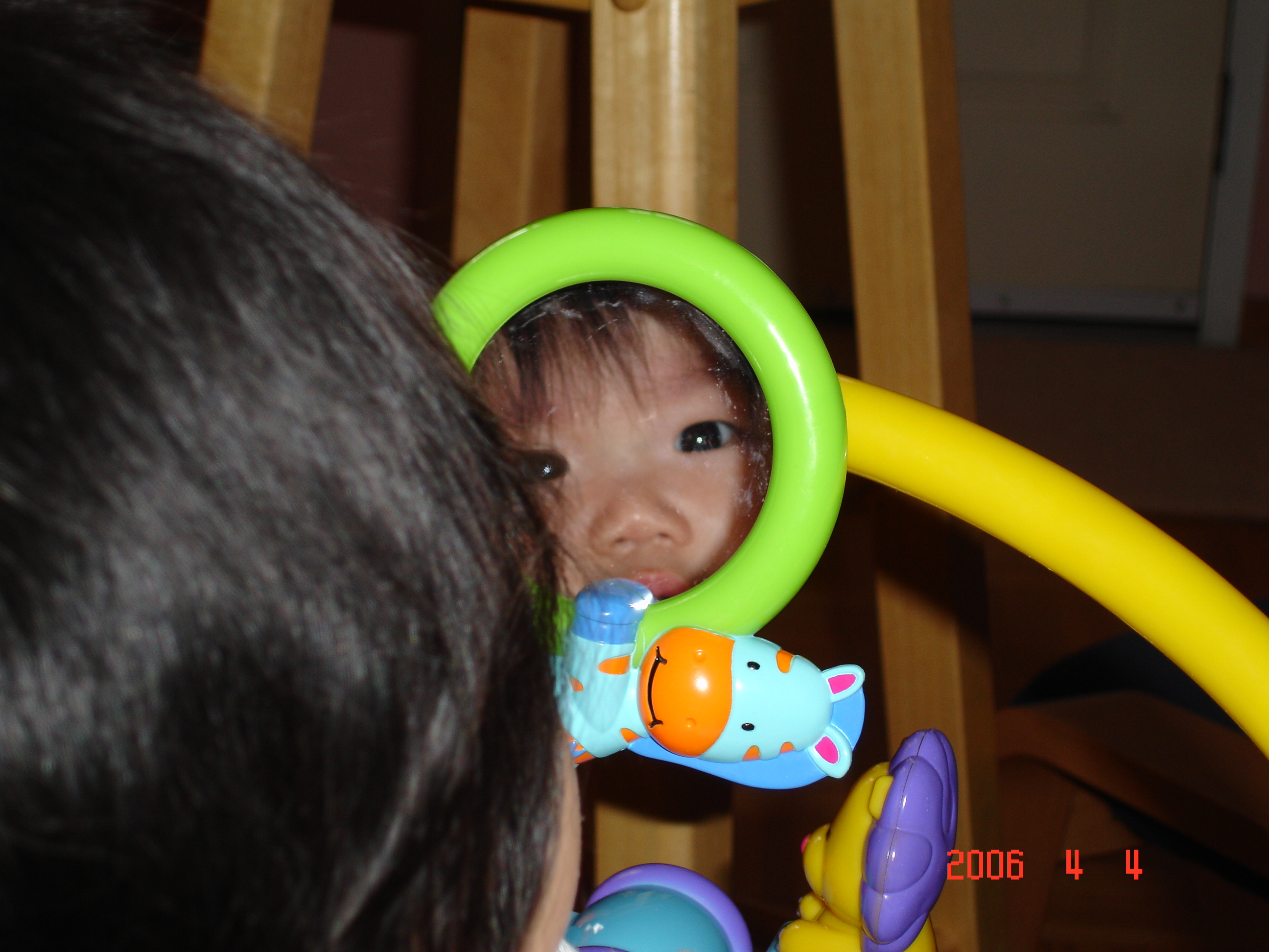 Felicia會自己調整小鏡子的角度, 看看鏡子裡的自己有什麼不一樣, 然後對著鏡子笑, 常常伸手摸摸鏡子裡的自己.