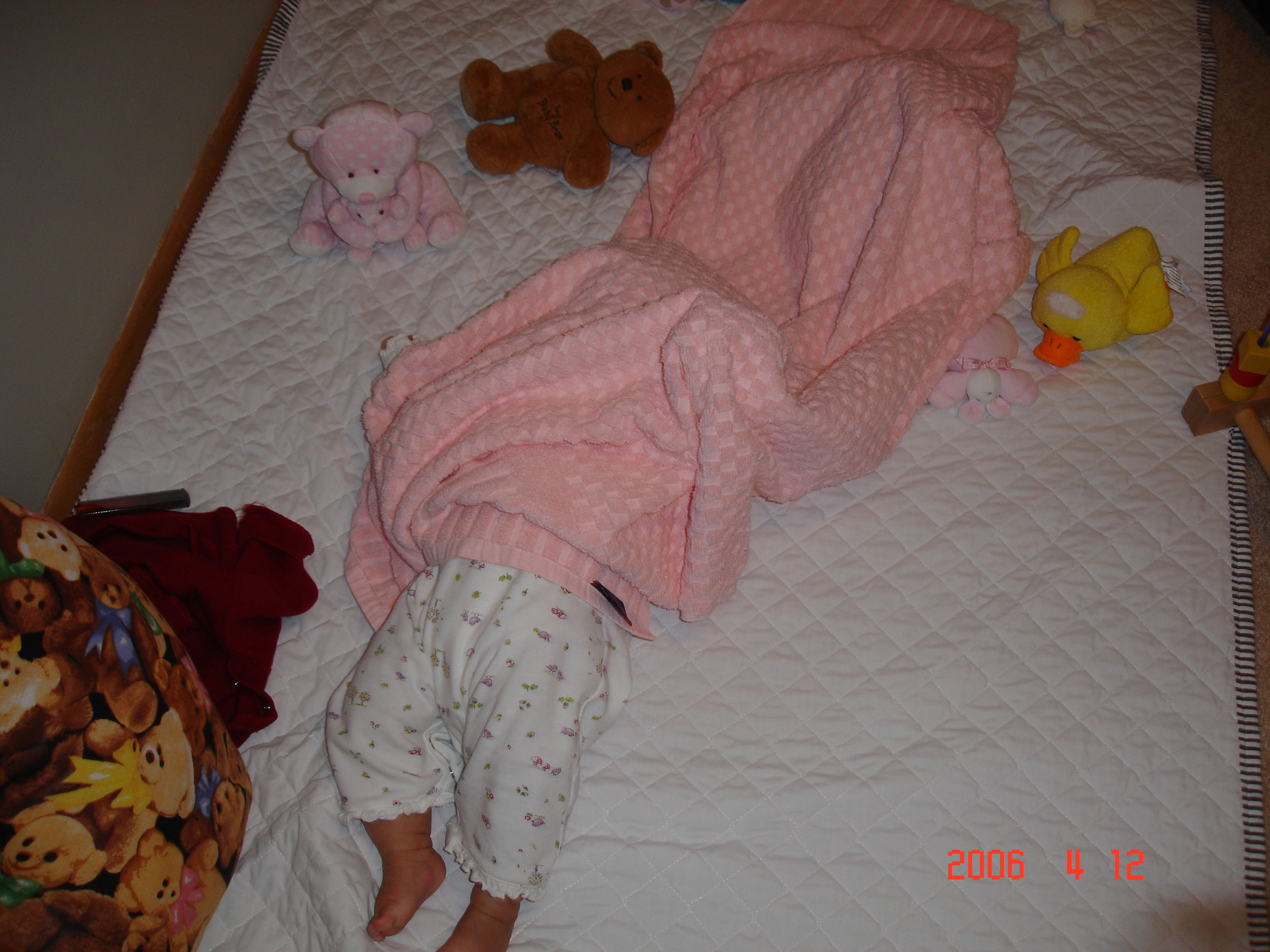 Felicia自己在地上玩, 居然可以把四摺蓋在肚上的小被子, 玩成這個樣子