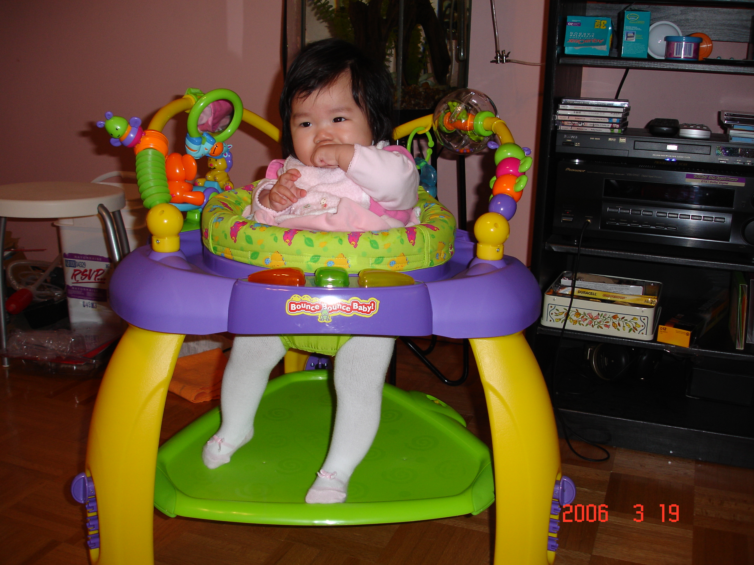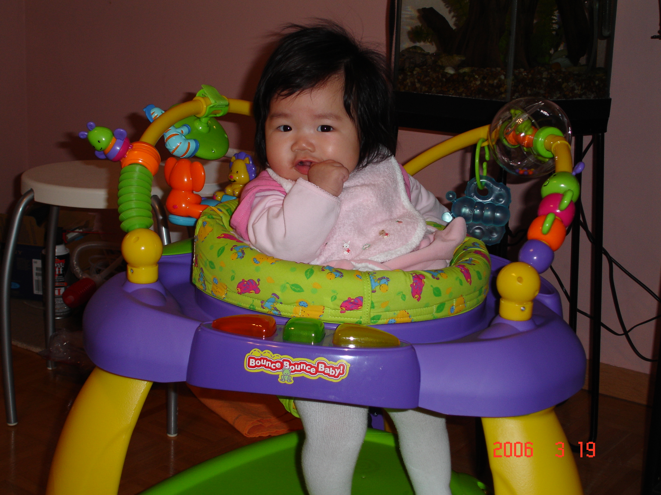 下面綠色的板子是讓baby學習蹬腳尖用的, 一蹬就會發出聲音, Felicia現在的腿還很短, 還有四格可以往下調整.