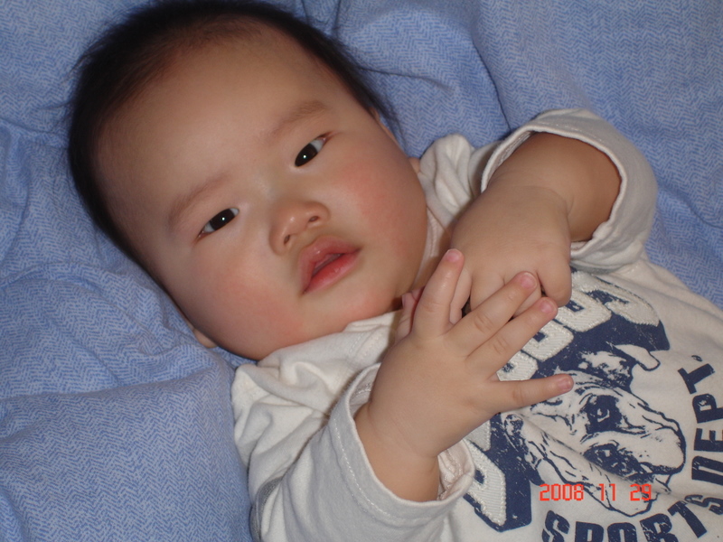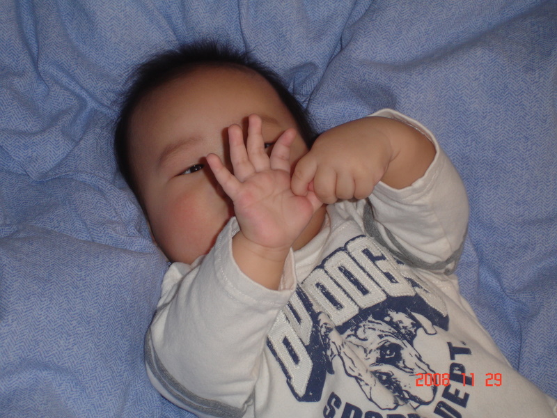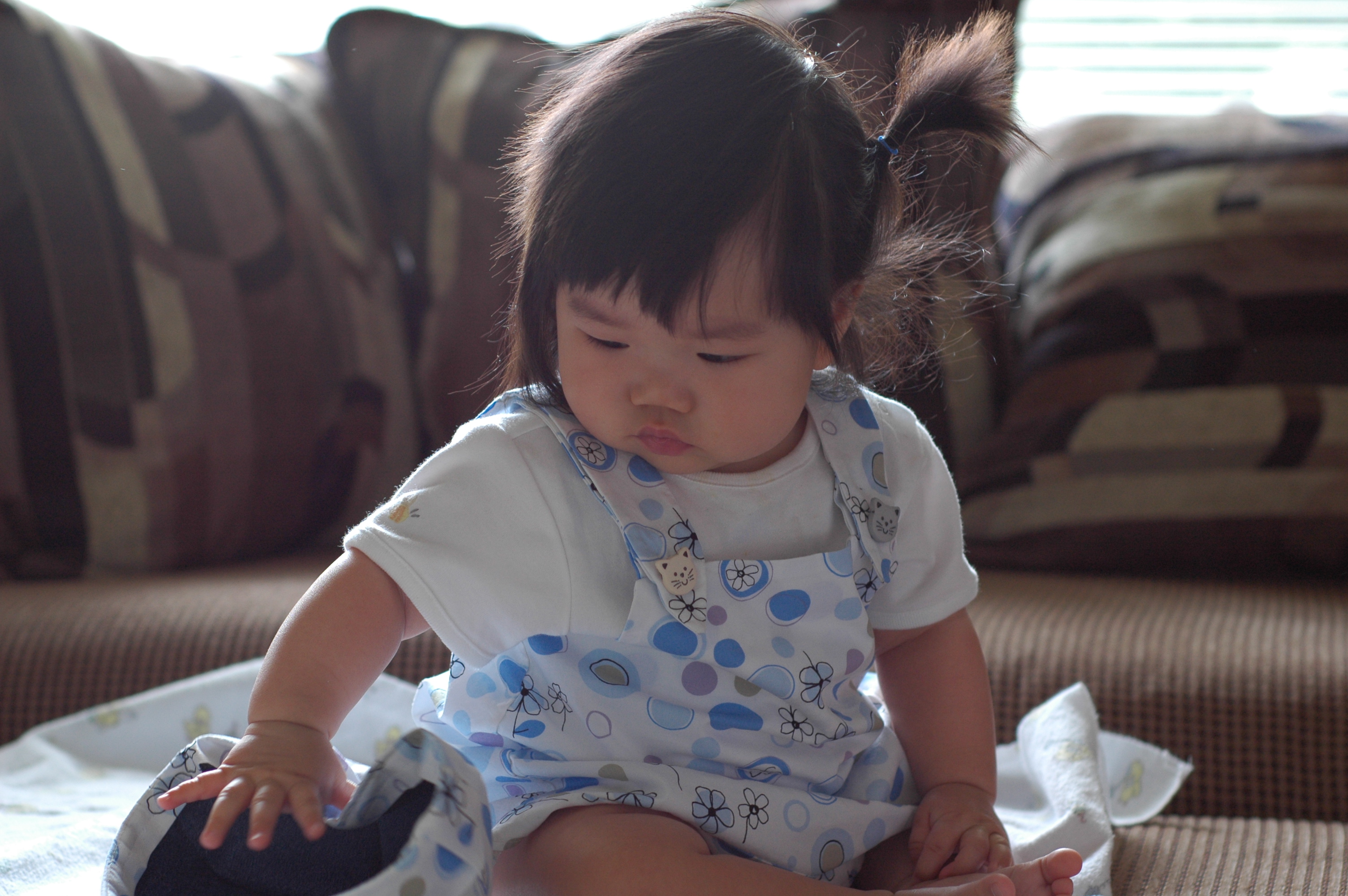 Felicia第一次穿泳裝, 在床上乾泳, 等媽咪放水.