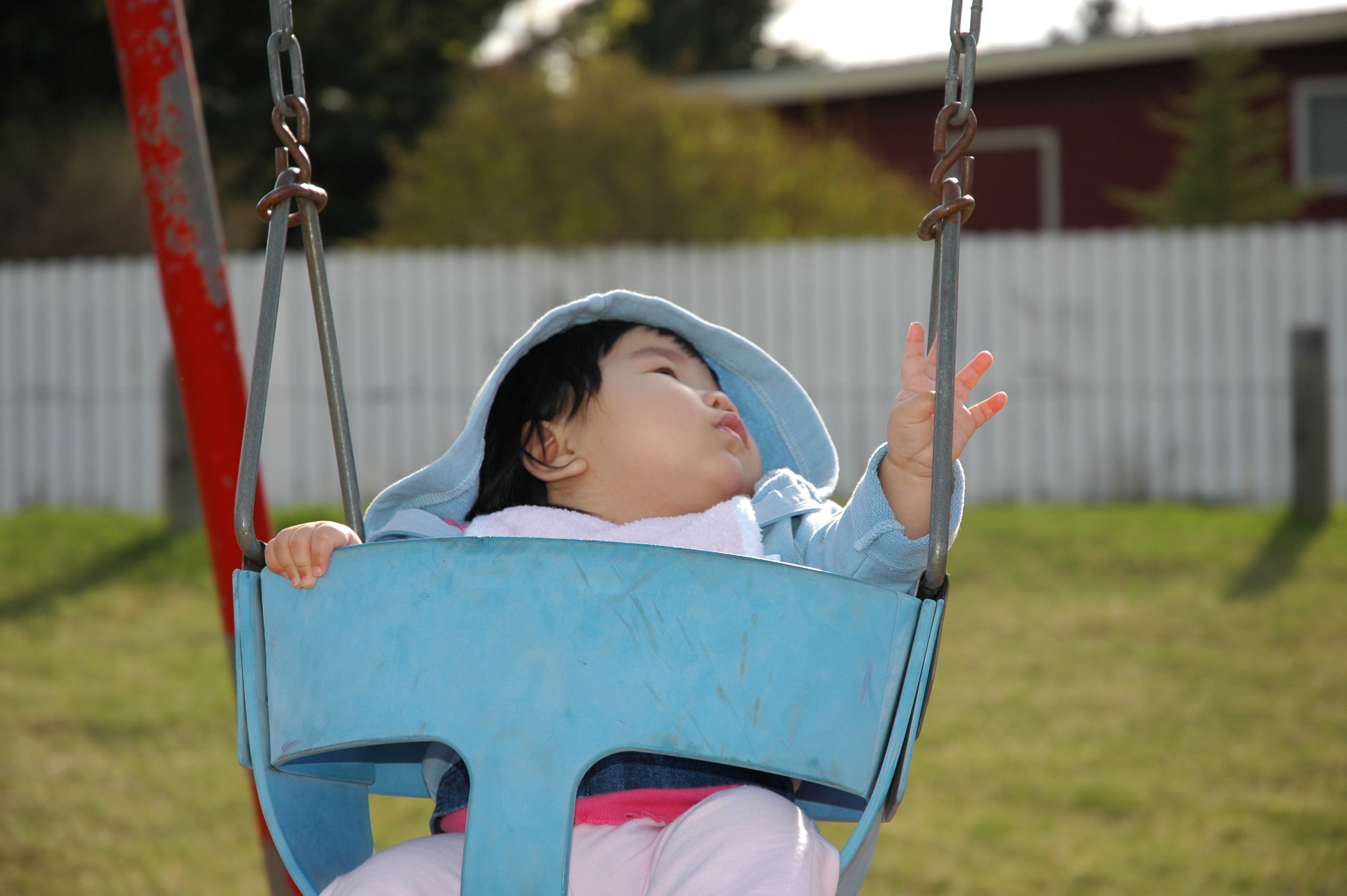 Felicia第一次坐盪鞦韆, 居然是放手往後仰看著天空, 一點都不害怕.