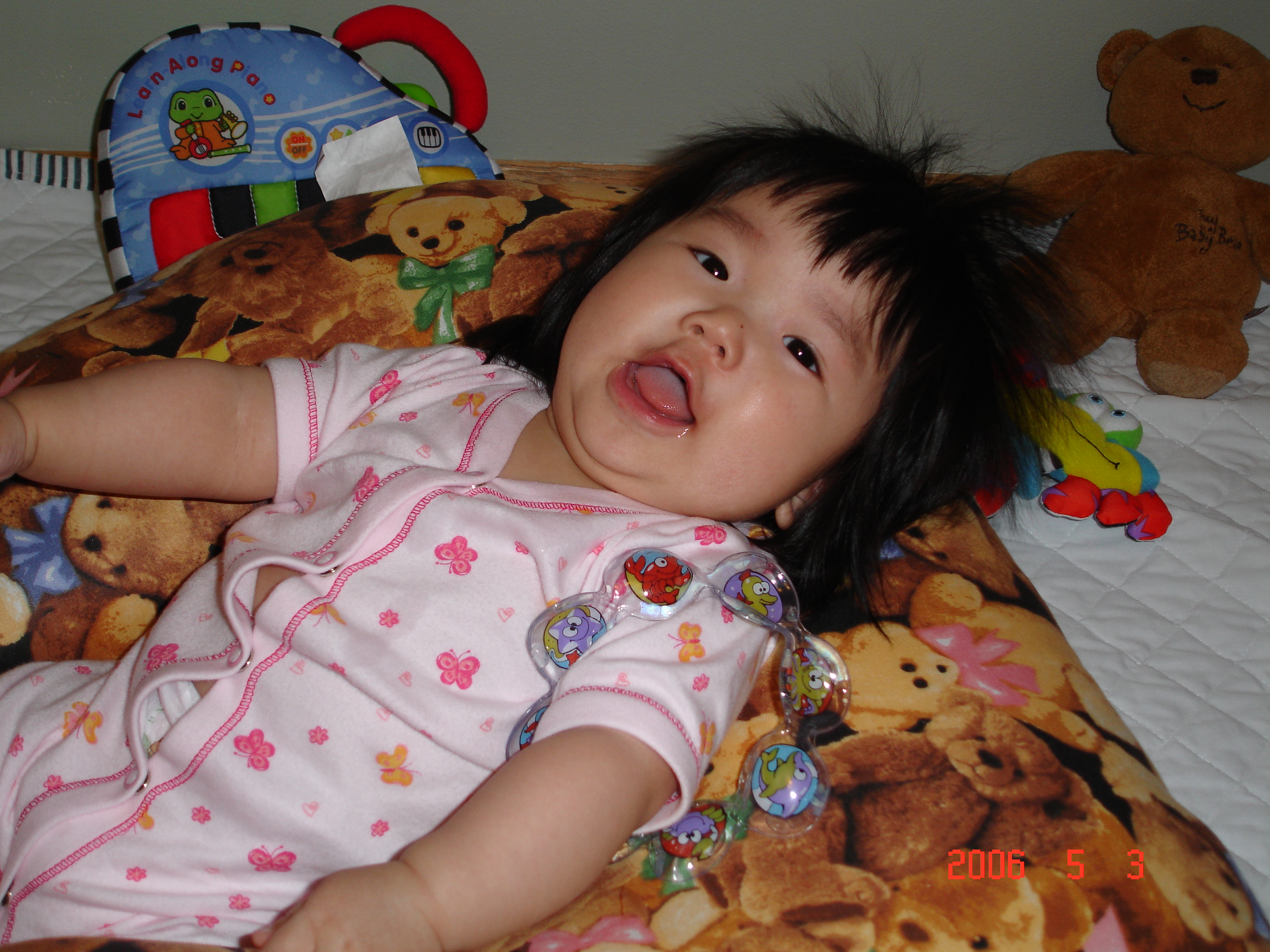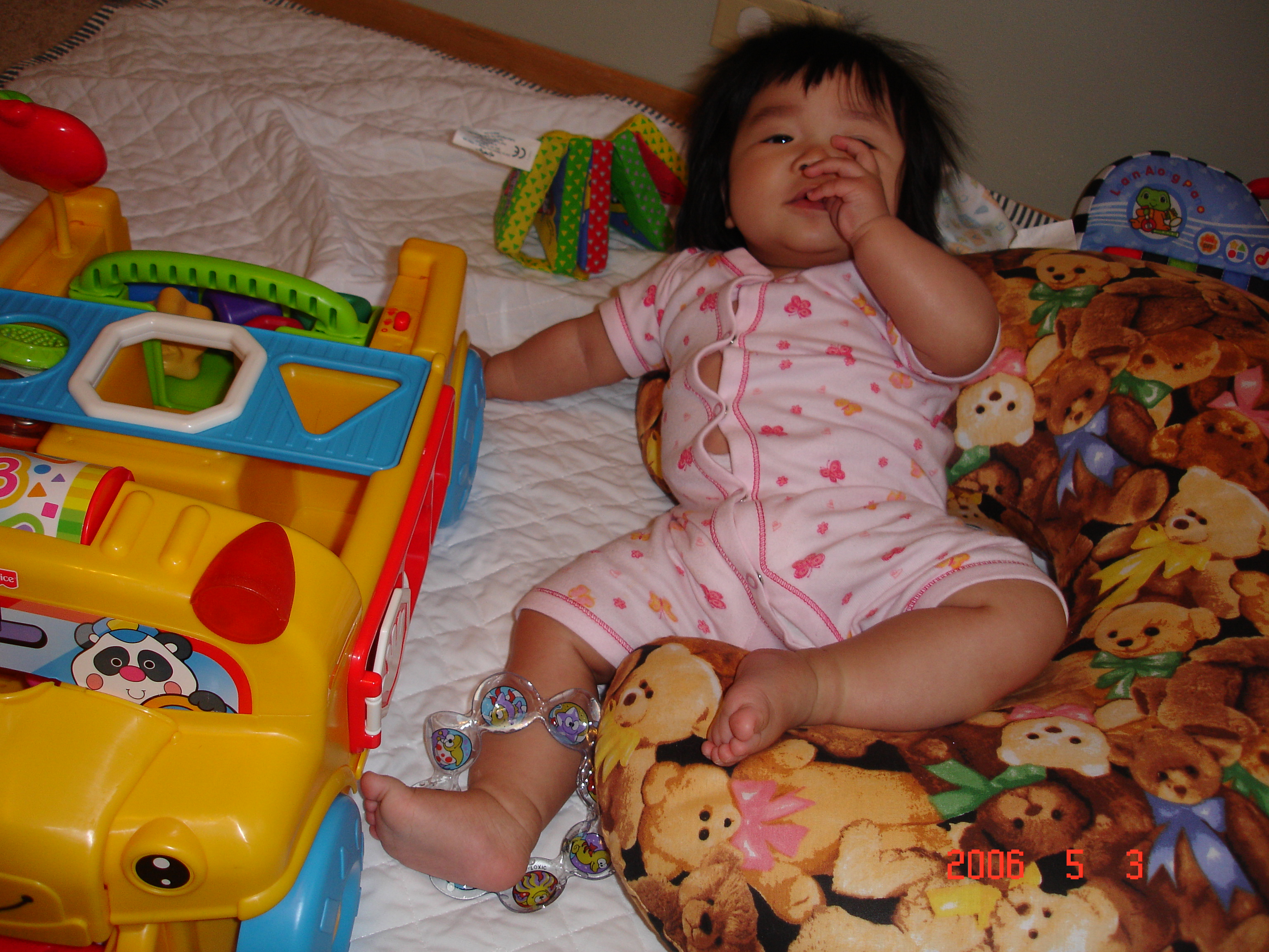 Felicia咬完固齒器後都會把它收到胳肢窩下當成臂環, 還不准媽咪把它拿走唷...