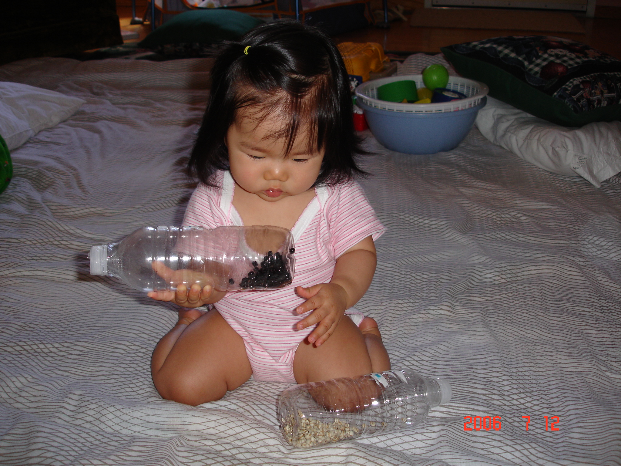 當Felicia搖樂器時, 很認真的看著黑豆的流動