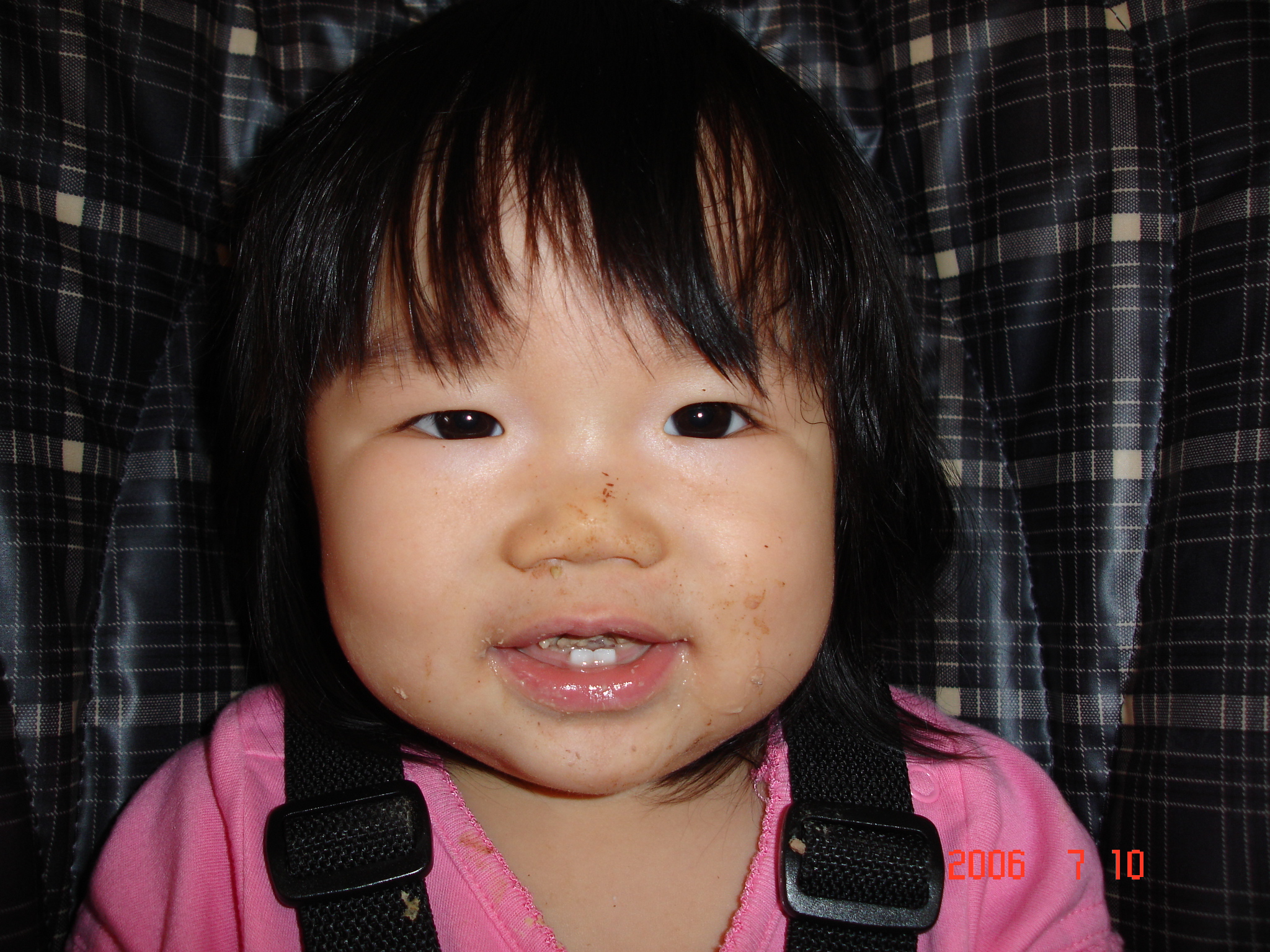 媽咪煮了一塊雞肝給Felicia吃, 沒想到Felicia不要吃磨成泥狀的雞肝, 要自己拿一小塊吃, 想當然而, 吃完後, 滿臉都是雞肝殘渣囉.