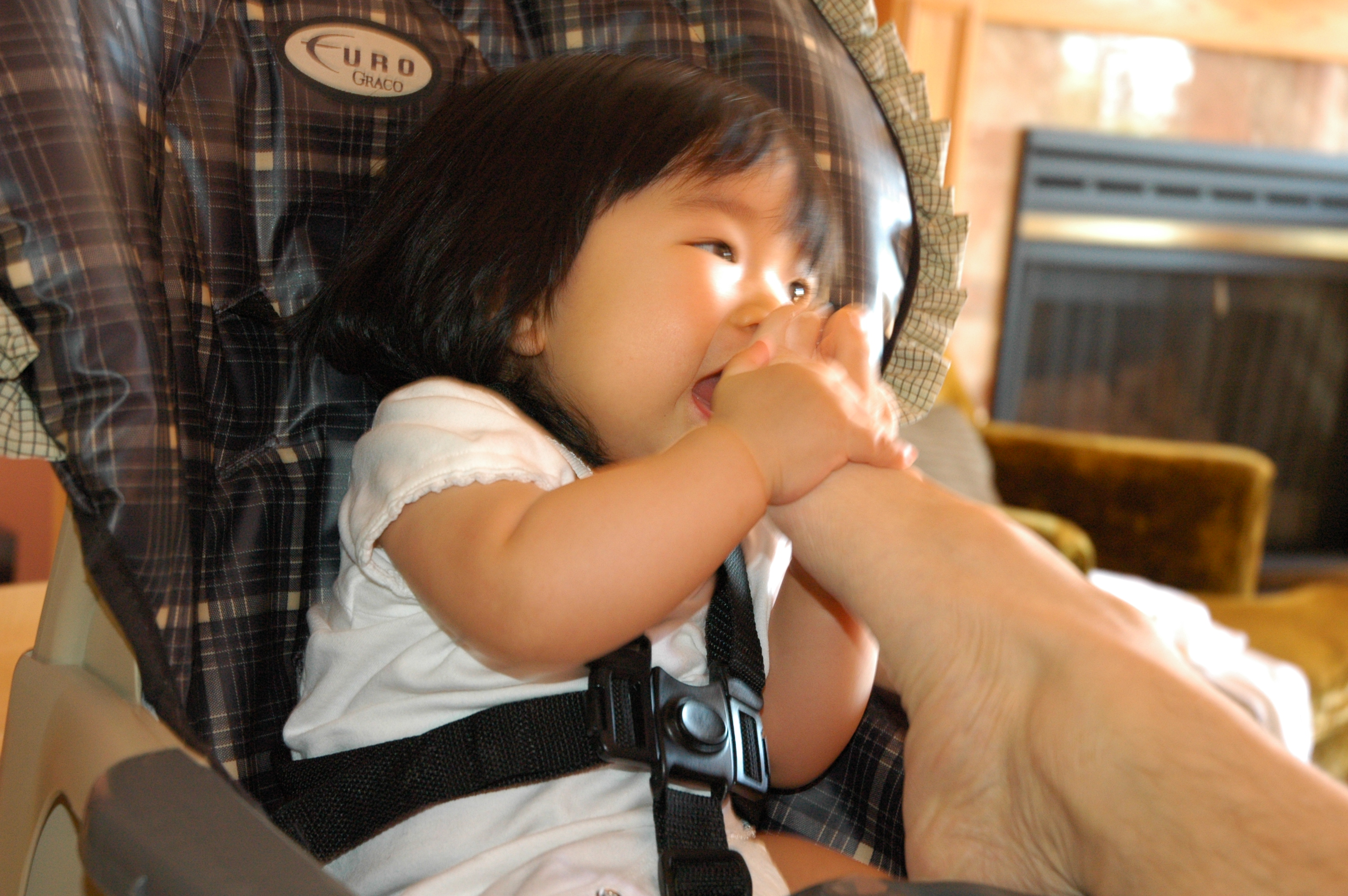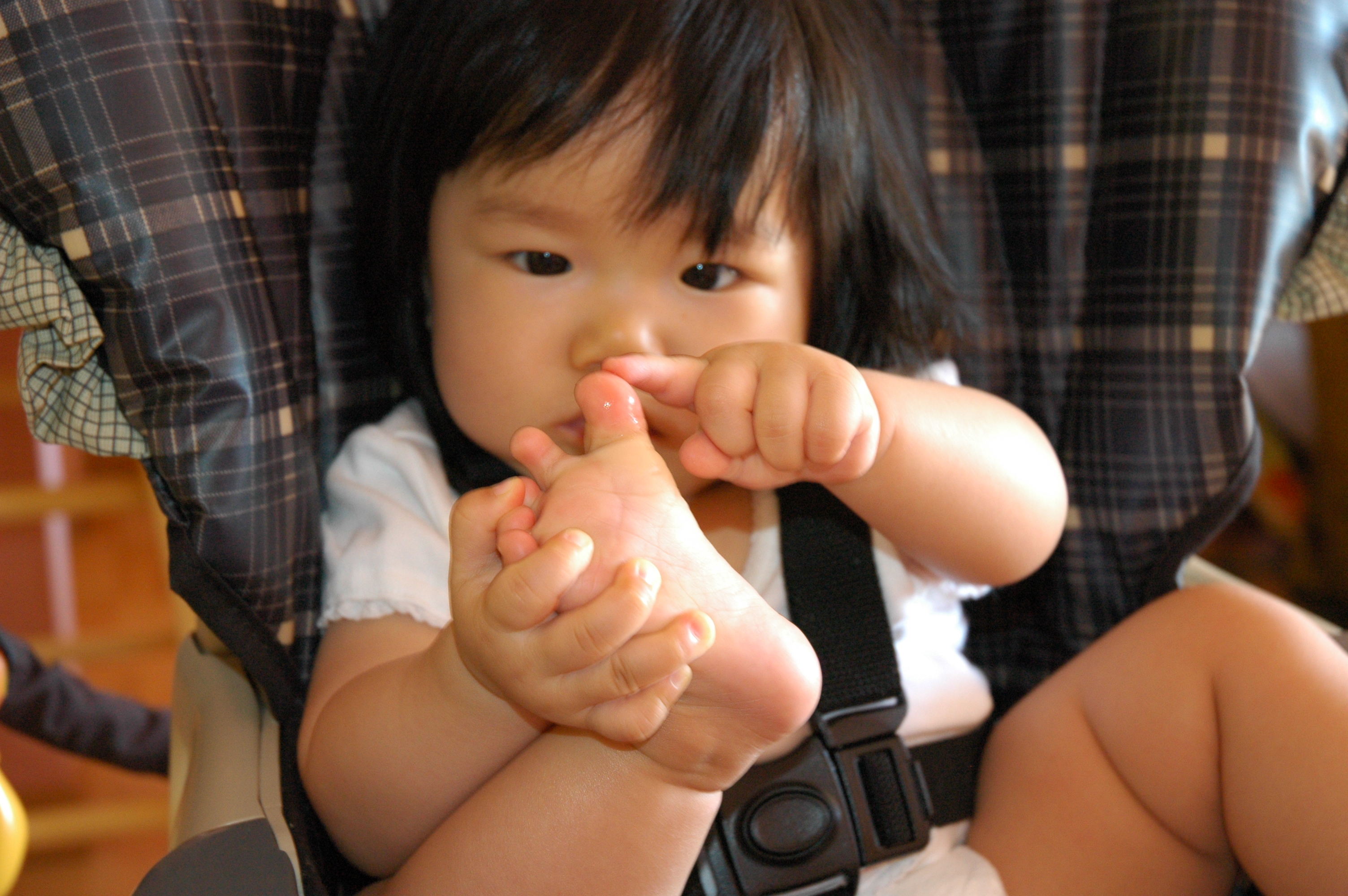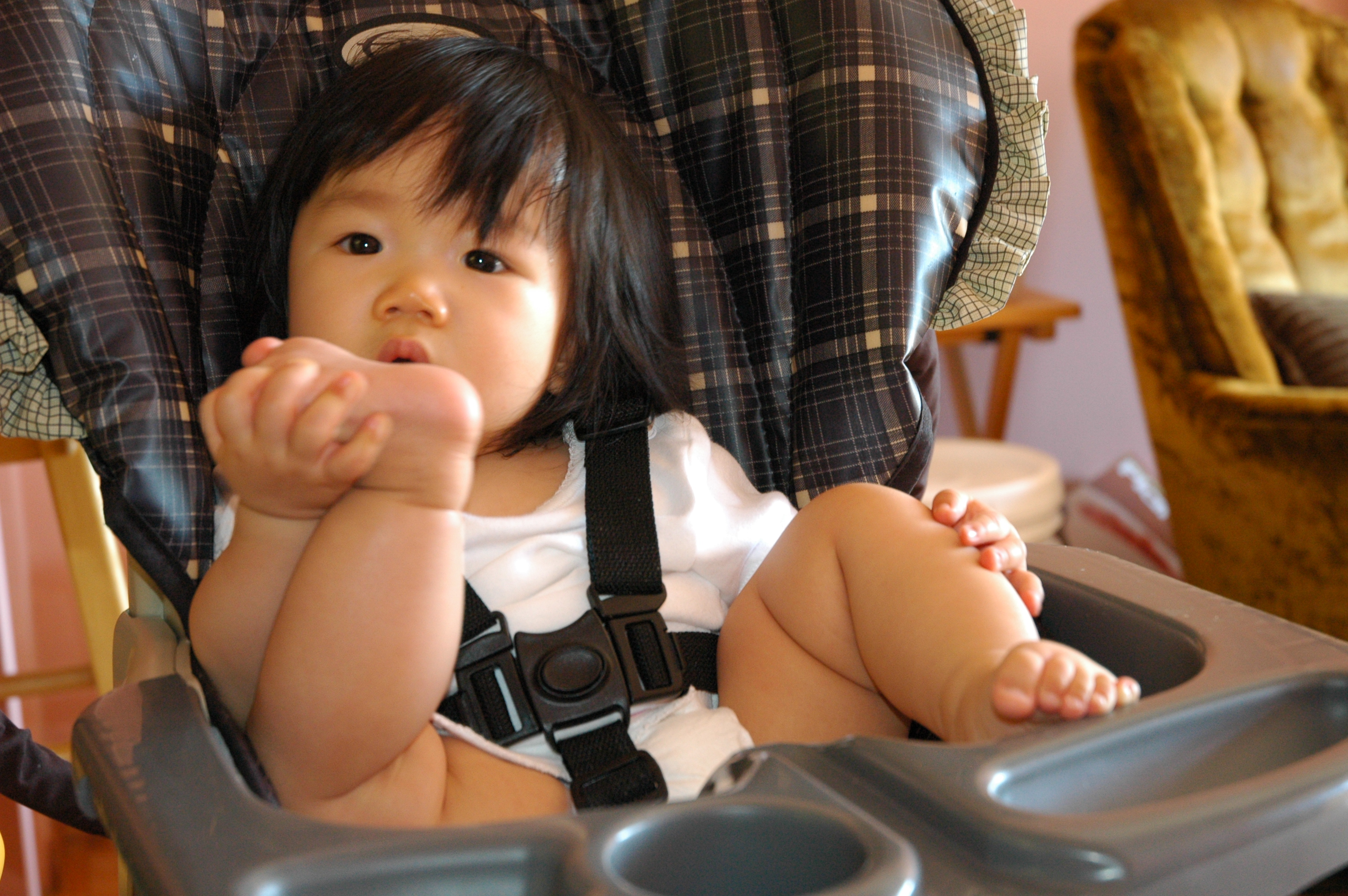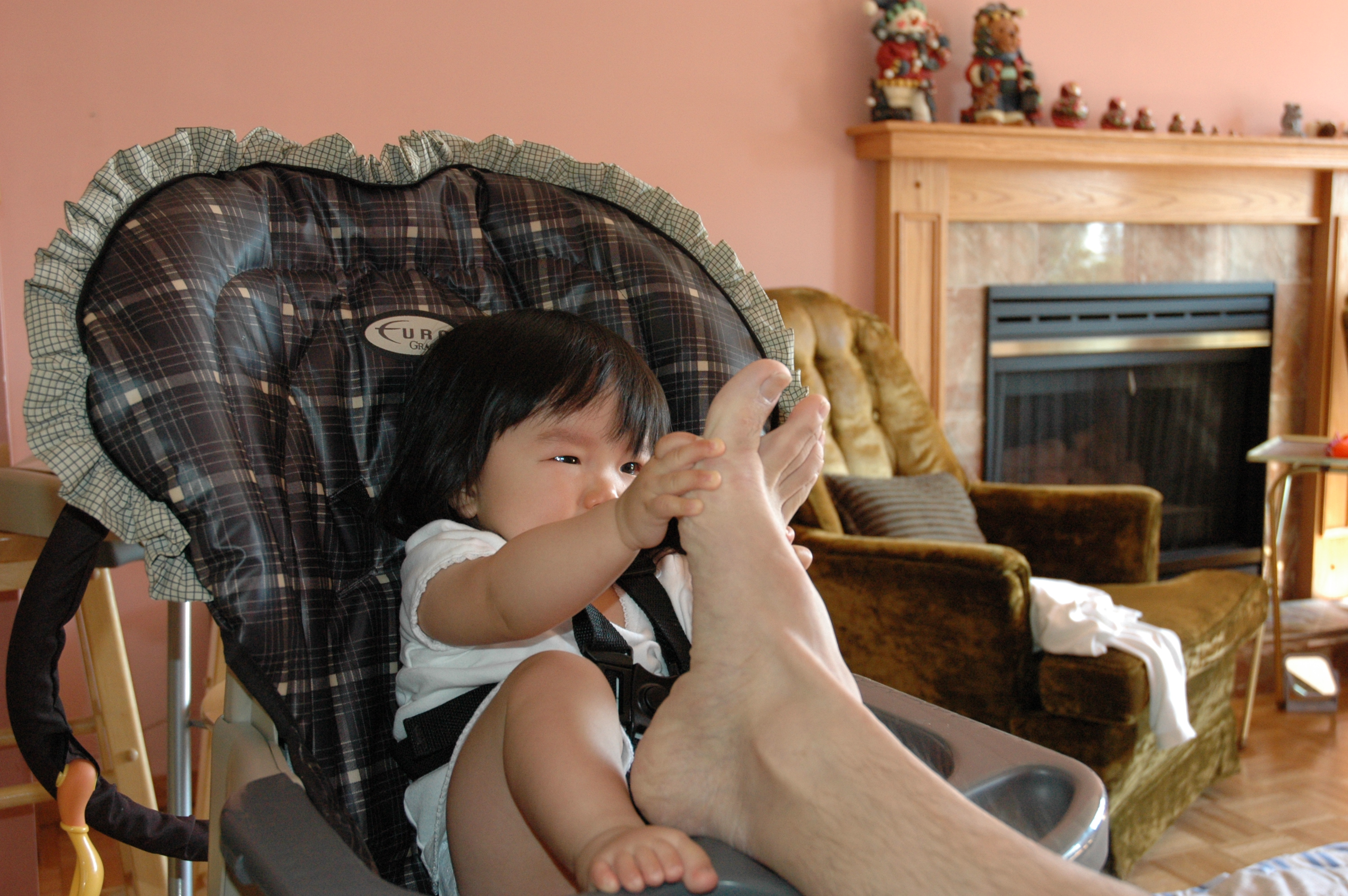 看看Felicia玩把拔的腳時的坐姿, 看來這樣坐才可以抓穩把拔的腳, 不讓它亂跑...