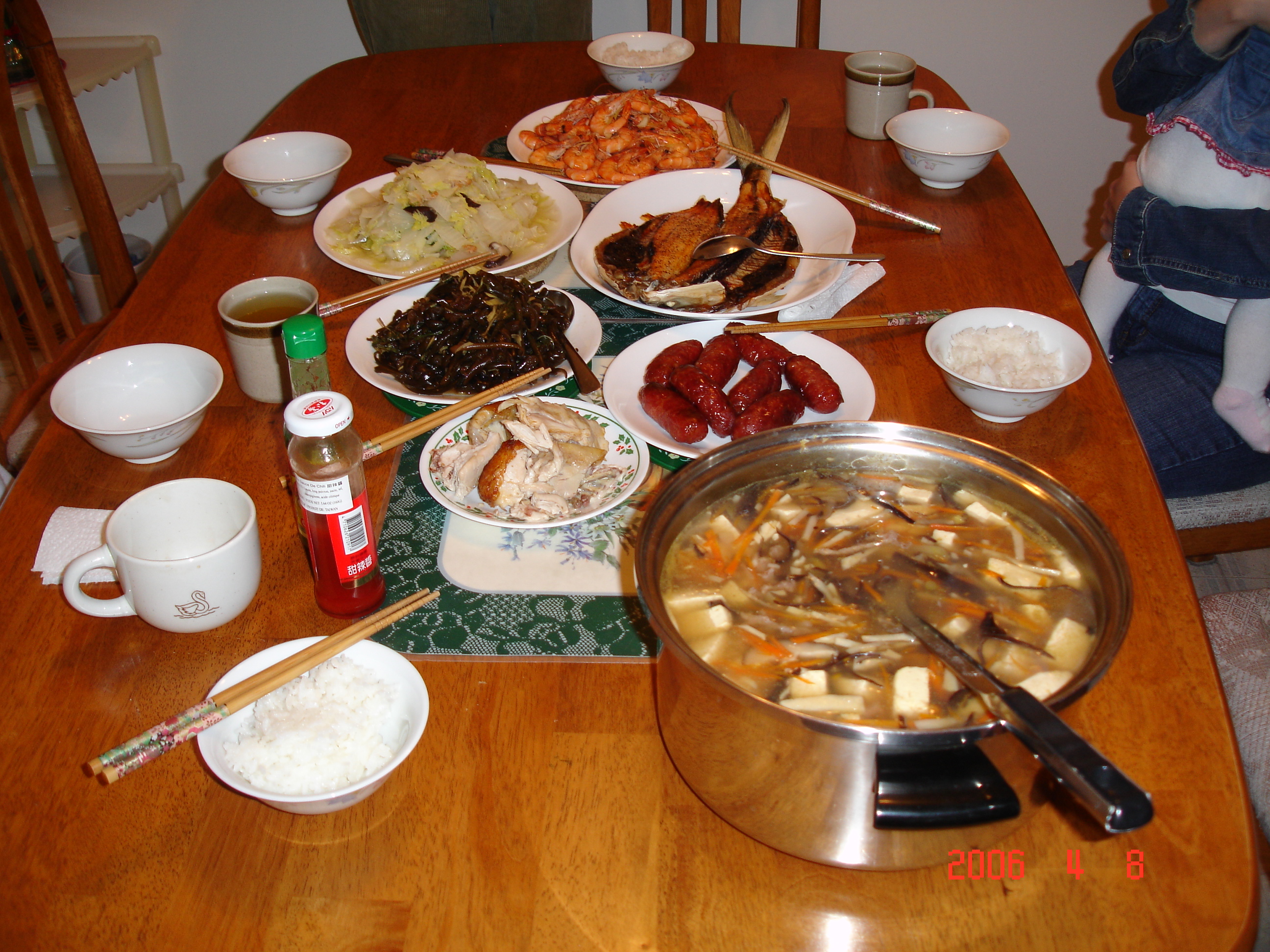 Yun準備豐盛的晚餐: 烤虱目魚, 烤台式香腸, 炒海茸, 炒蝦, 蝦米炒白菜, 酸辣湯.