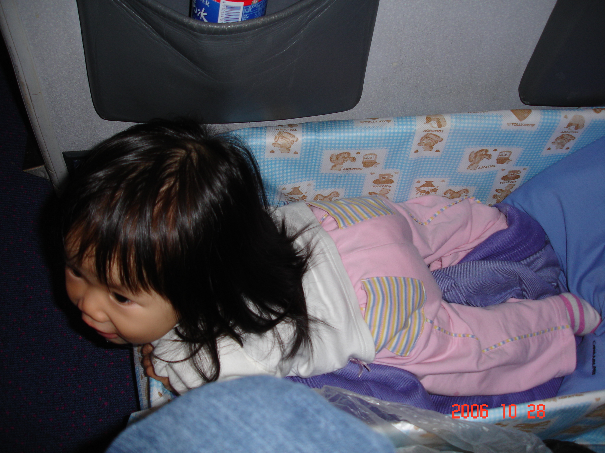 華航空姐給Felicia一個大紙箱當床, Felicia不睡時也可以在裡頭玩, 媽咪覺得是比掛在牆上的床安全多也舒服多了, 不過把拔媽咪的腿卻沒地方放, 一路下來很酸呢.